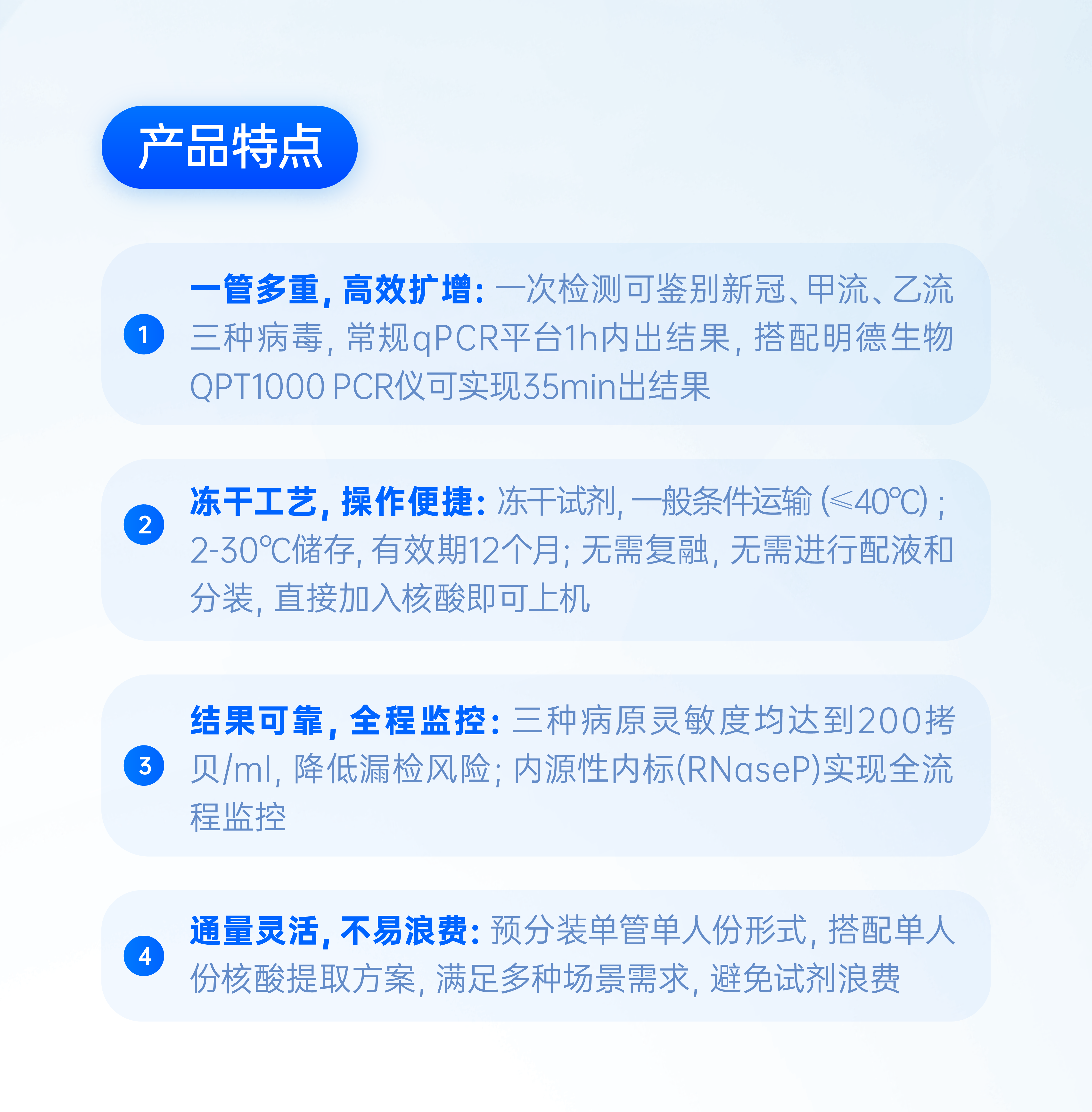 明德生物自主研發(fā)生產(chǎn)的新型冠狀病毒2019-nCoV、甲型流感病毒及乙型流感病毒核酸檢測(cè)試劑盒(熒光PCR法),可提升臨床對(duì)于新冠及流感病毒的診斷能力,能夠滿足醫(yī)療機(jī)構(gòu)急診科、兒科、發(fā)熱門診、檢驗(yàn)科等不同應(yīng)用場(chǎng)景下相關(guān)呼吸道感染輔助診斷的需求,有效提高病毒檢出率的同時(shí),降低復(fù)診和等待周期,在多種呼吸道病原體流行高發(fā)時(shí)節(jié)加快臨床/門診診療效率。