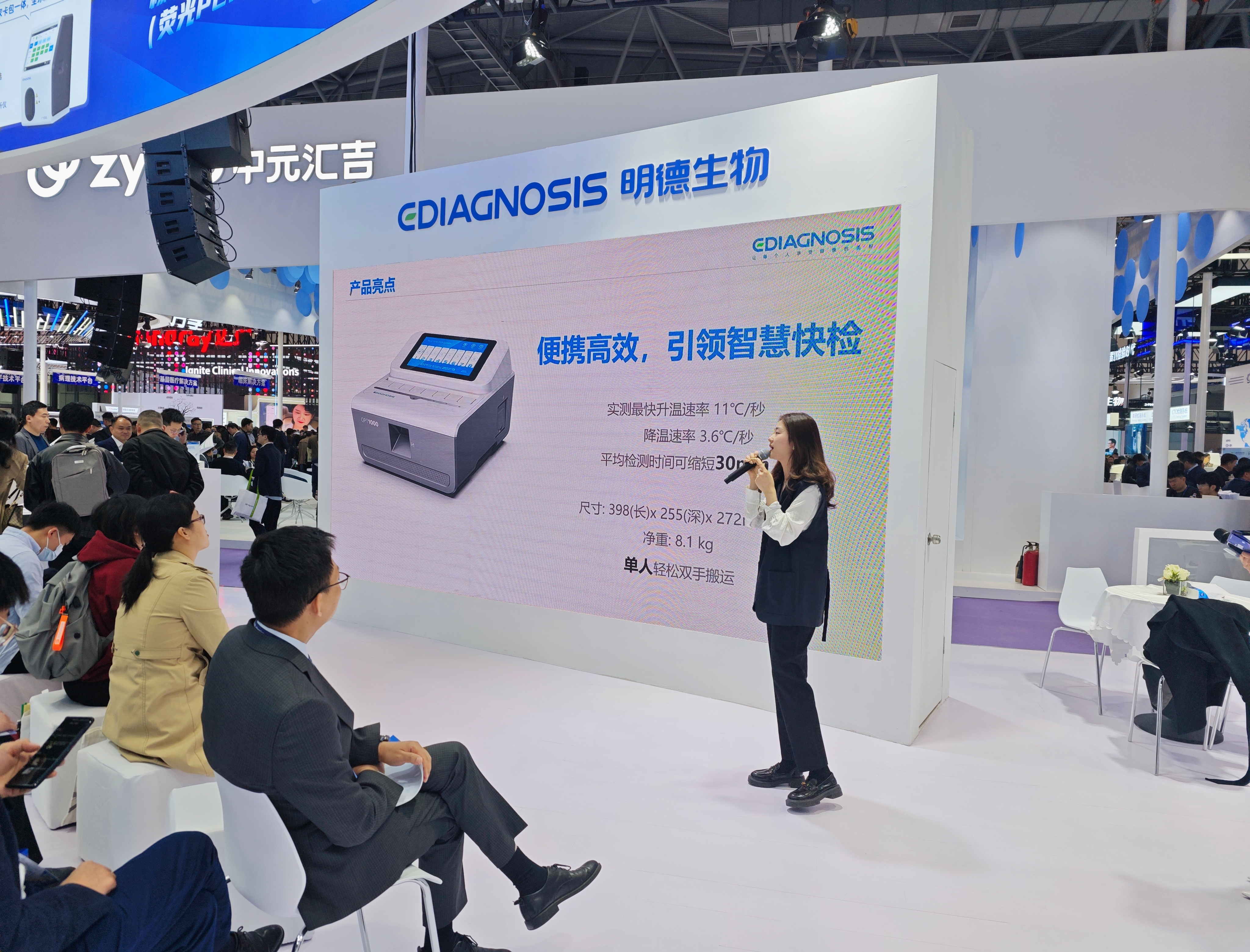在感染領(lǐng)域展區(qū),明德生物的生殖道病原體核酸檢測試劑盒及呼吸道快速檢測解決方案憑借多聯(lián)檢技術(shù)、凍干預混試劑及 30 分鐘快速檢測優(yōu)勢成為焦點,吸引眾多專業(yè)訪客駐足,展開深入探討。他們圍繞產(chǎn)品性能、臨床價值及場景適配性展開深度交流,對其精準診斷能力、操作便捷性及資源適配性給予認可。