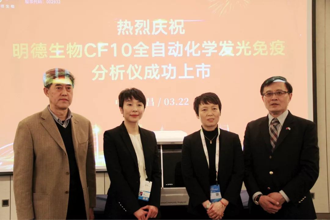 在宋海波會長、居軍主任、陳莉莉博士、王穎博士的共同揭幕下,明德生物小型全血POCT化學(xué)發(fā)光免疫分析儀CF10完美亮相。
