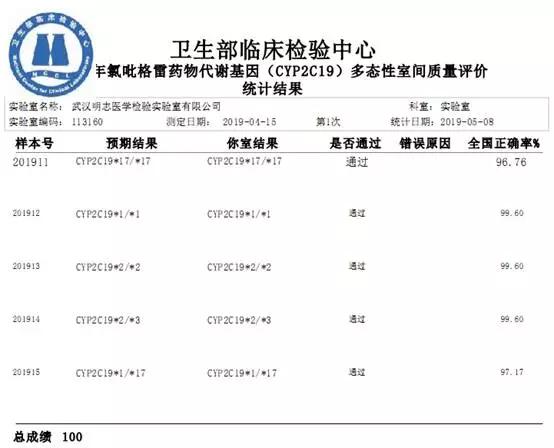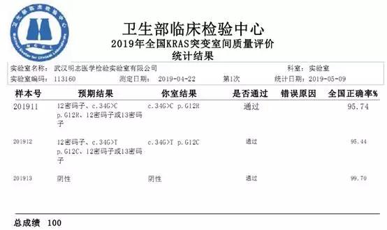明德生物控股子公司武漢明志醫(yī)學(xué)檢驗實驗室有限公司參加衛(wèi)生部臨檢中心EGFR、腫瘤游離DNAEGFR、ALK、KRAS、氯吡格雷藥物代謝基因(CYP2C19)、人乳頭瘤病毒(HPV)分型共6個項目第一次室間質(zhì)量評價結(jié)果全部滿分通過,再次驗證了明志醫(yī)學(xué)檢驗室實驗的檢測流程規(guī)范,判讀準(zhǔn)確。