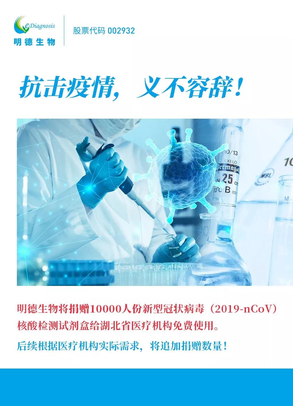 抗擊新型肺炎,明德生物義不容辭!經(jīng)公司研究決定,明德生物將把生產(chǎn)出來的“新型冠狀病毒(2019-nCoV)核酸檢測試劑盒”(在取得注冊證后)捐贈給湖北省醫(yī)療機構(gòu)免費使用,捐贈數(shù)量不低于10000人份,以全力支持此次新型冠狀病毒防控戰(zhàn)役!后續(xù)將根據(jù)湖北省醫(yī)療機構(gòu)實際需求情況,繼續(xù)追加捐贈數(shù)量。