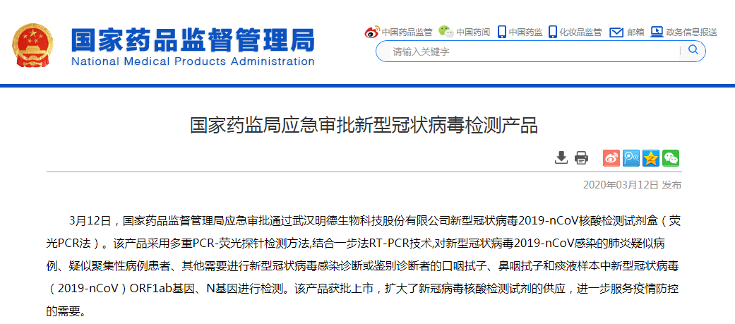3月12日,國家藥品監(jiān)督管理局應急審批通過武漢明德生物科技股份有限公司新型冠狀病毒2019-nCoV核酸檢測試劑盒(熒光PCR法)。