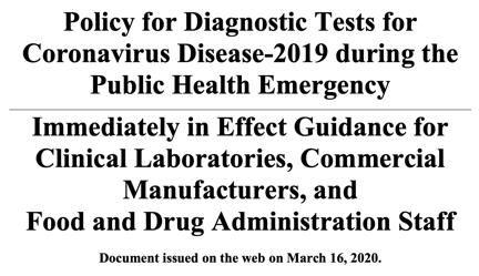 北京時間3月17日夜,F(xiàn)DA緊急出臺最新新冠病毒檢測指導(dǎo)政策 【Policy for Diagnostic Tests for Coronavirus Disease-2019 during the Public Health Emergency】
