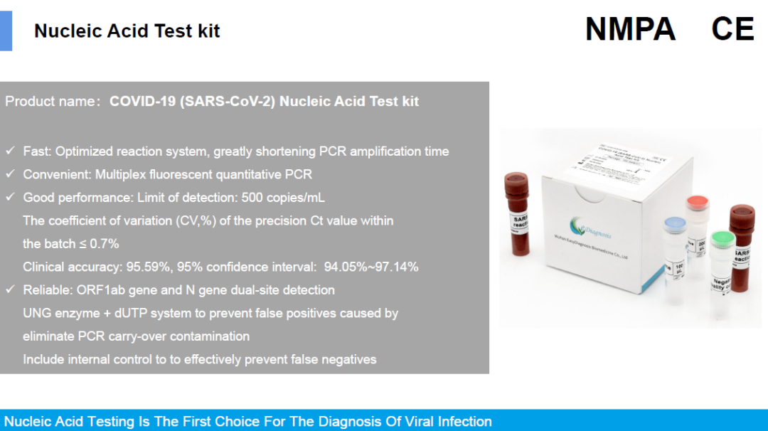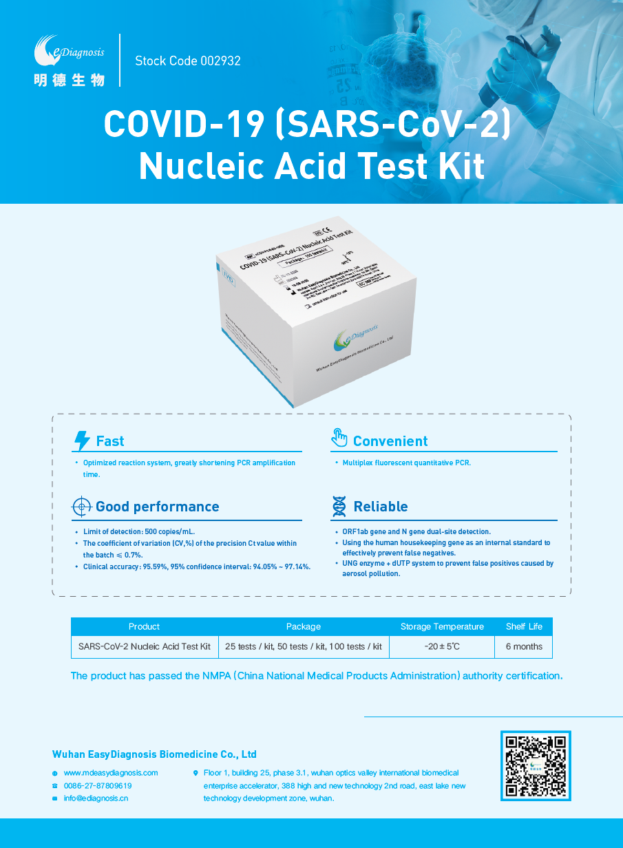 明德生物新型冠狀病毒 (2019-nCoV) 核酸檢測試劑盒(熒光PCR法)兼容性佳,可兼容具備FAM、VIC、ROX 通道的實(shí)時(shí)熒光定量PCR儀;且與市場同類的常規(guī)熒光PCR試劑相比節(jié)省了30-40分鐘的上機(jī)檢測時(shí)間;在性能方面,靈敏度可達(dá)中檢院國家靈敏度參考品S6水平,精密度高。能夠有效、快速地支持新型冠狀病毒患者診斷,滿足全球范圍內(nèi)疫情現(xiàn)場的快速檢測需求,助力國際新冠疫情防控工作。