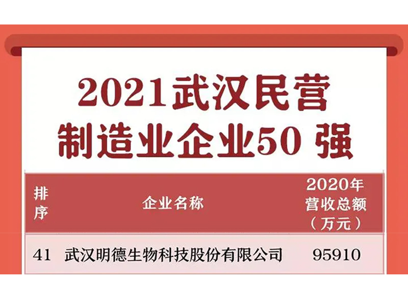 近期,武漢市工商聯(lián)發(fā)布“2021武漢民營企業(yè)100強(qiáng)”和“2021武漢民營制造業(yè)企業(yè)50強(qiáng)”榜單。明德生物榜上有名,躋身“武漢民營制造業(yè)企業(yè)50強(qiáng)”。