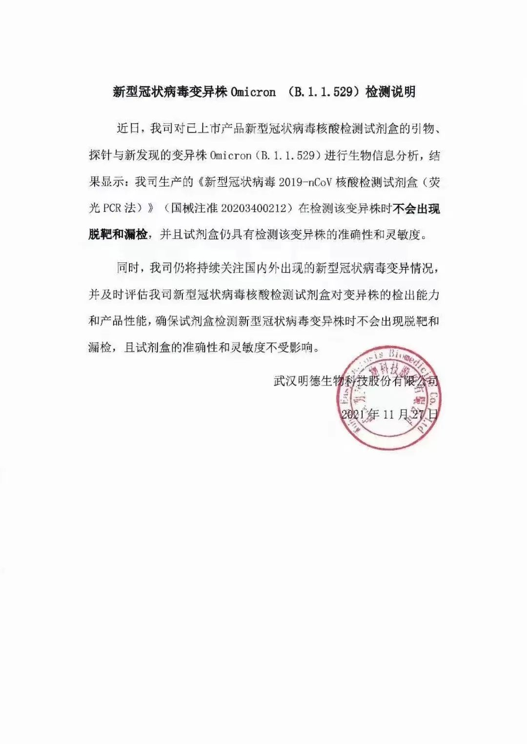 “近日,我司對(duì)已上市產(chǎn)品新型冠狀病毒核酸檢測試劑盒的引物、探針與新發(fā)現(xiàn)的變異株Omicron(B.1.1.529)進(jìn)行生物信息分析,結(jié)果顯示:我司生產(chǎn)的新型冠狀病毒2019-nCoV核酸檢測試劑盒(熒光PCR法)(國械注準(zhǔn)20203400212)在檢測該變異株時(shí)不會(huì)出現(xiàn)脫靶和漏檢,并且試劑盒仍具有檢測該變異株的準(zhǔn)確性和靈敏度。”